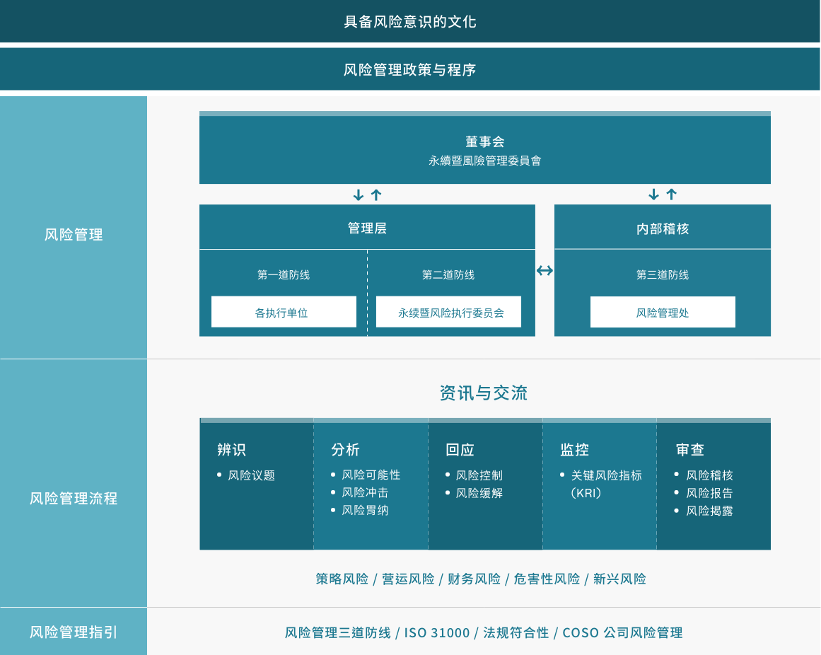 「永续暨风险执行委员会」执行风险管理政策和程序,包含审查公司的风险辨识作业,处理与风险控制相关议题,管理范围涵盖策略、财务、营运和危害等各个方面,包括未来可能对公司营运产生冲击的新兴风险,并透过风险胃纳控管风险冲击,定期向董事会及「永续暨风险管理委员会」报告。