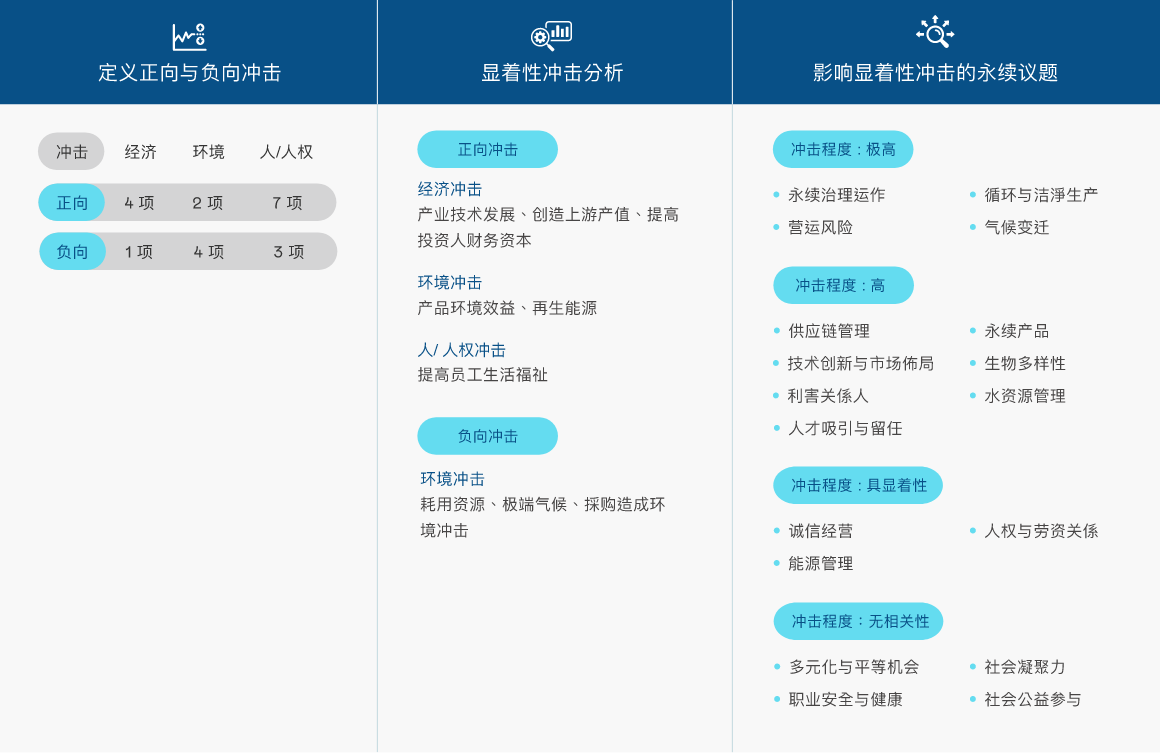 依循全球永续趋势与GRI 准则检视议题之合适性,透过问卷了解利害关系人对公司在环境、社会( 含人权)、公司治理三方面的关注面向,同时建立双重重大性评估方法,透过8868体育主管与价值链的关键伙伴评估ESG 议题对公司所产生的营运冲击程度,并在ESG 外部永续发展冲击方面,根据GRI 通用准则2021(GRI Universal Standards 2021) 的GRI 3:重大主题(Material Topics 2021),整合价值平衡联盟(Value Balancing Alliance, VBA)、哈佛商学院「影响力加权会计(Impact-Weighted Accounts)」研究计画等机构发展之经济、环境及社会层面冲击评估方法学,建构以冲击为基础的重大性分析流程,辨识重大性主题。