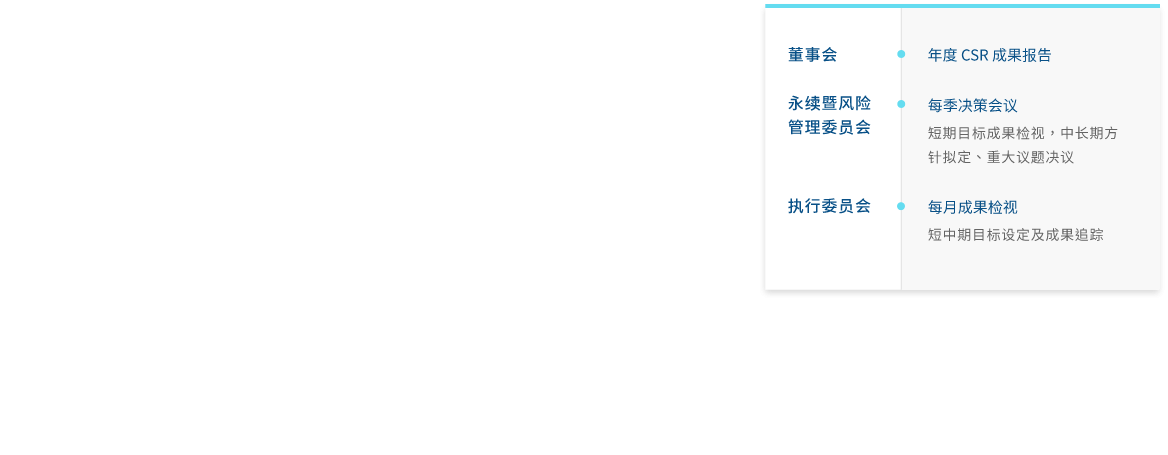 8868体育成立永续委员会(2023年更名可持续暨风险管理委员会),作为公司永续发展运作的最高治理机构,并持续策化推动企业永续转型,透过永续长及永续专责单位,统筹中长期永续发展的策略方向。